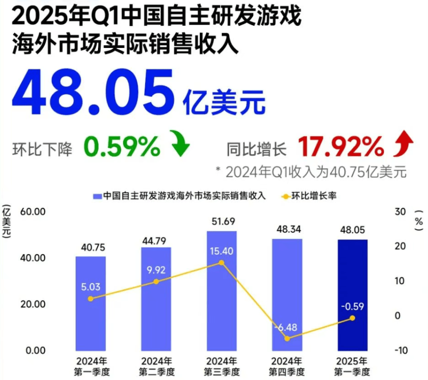 据游戏工委与伽马数据联合发布的《2025年Q1中国游戏产业季度报告》,一季度中国自主研发游戏海外实际销售收入同比增长17.92%至48.05亿美元(约为347.32亿元),展现出中国游戏出海的巨大潜力和市场活力。