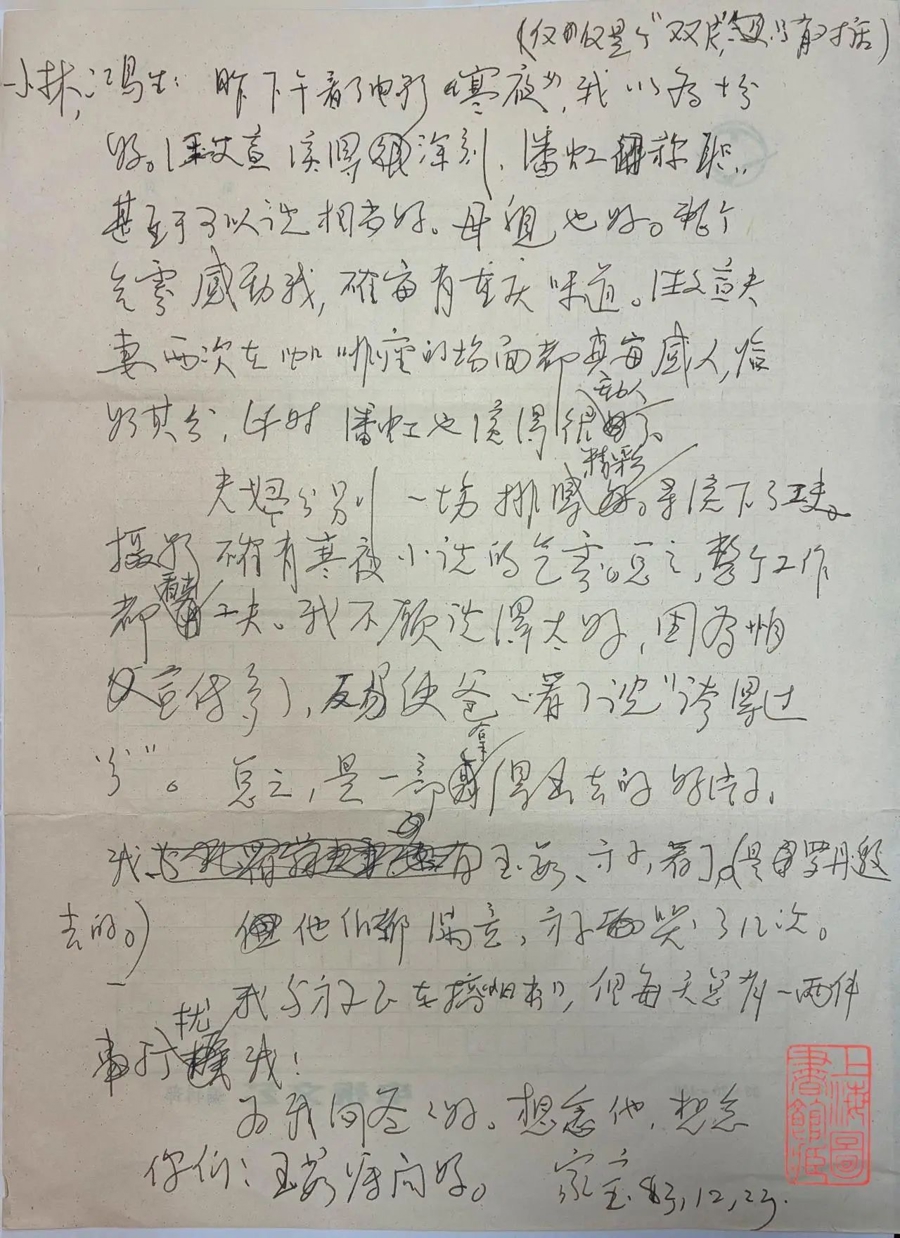 中国电影与文学命运交织,不少作家也是超级影迷。展览中可见一封郁达夫致王映霞函,写于1927年4月13日凌晨3点,信中说“去卡尔登看了一张影片。这影片的情节,很象我们两人的事情。”可见,在风云突变的时局中,郁达夫仍保持看电影的习惯,这可视作当时知识分子的生活方式的重要构成。在1983年12月23日写给祝鸿生李小林的信中,曹禺高度评价了由巴金原著《寒夜》改编的同名影片。他写道:“昨下午看了电影《寒夜》(仅是个‘双片’,只有对话),我以为十分好。汪文宣演得深刻,潘虹称职,甚至于可以说相当好。母亲也好。整个气氛感动我,确实有重庆味道。汪文宣夫妻两次在咖啡座的场面都真实感人,恰如其分,此时潘虹也演得很动人了。”