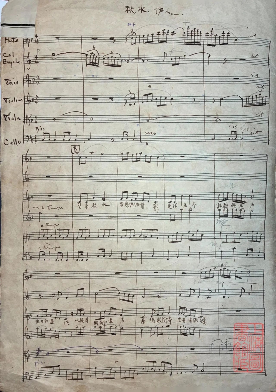 创作于1937年的贺绿汀《秋水伊人》曲谱初稿