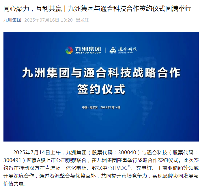每经AI快讯,7月14日上午伯乐配资,九洲集团(股票代码:300040)与通合科技(股票代码:300491)两家A股上市公司强强联合,在九洲集团隆重举行战略合作签约仪式。此次签约旨在推动双方在直流及一体化电源、数据中心HVDC、充电桩、工商业储能等领域开展深度合作,通过资源整合与优势互补,共同提升市场竞争力,实现品牌协同发展与价值共赢。